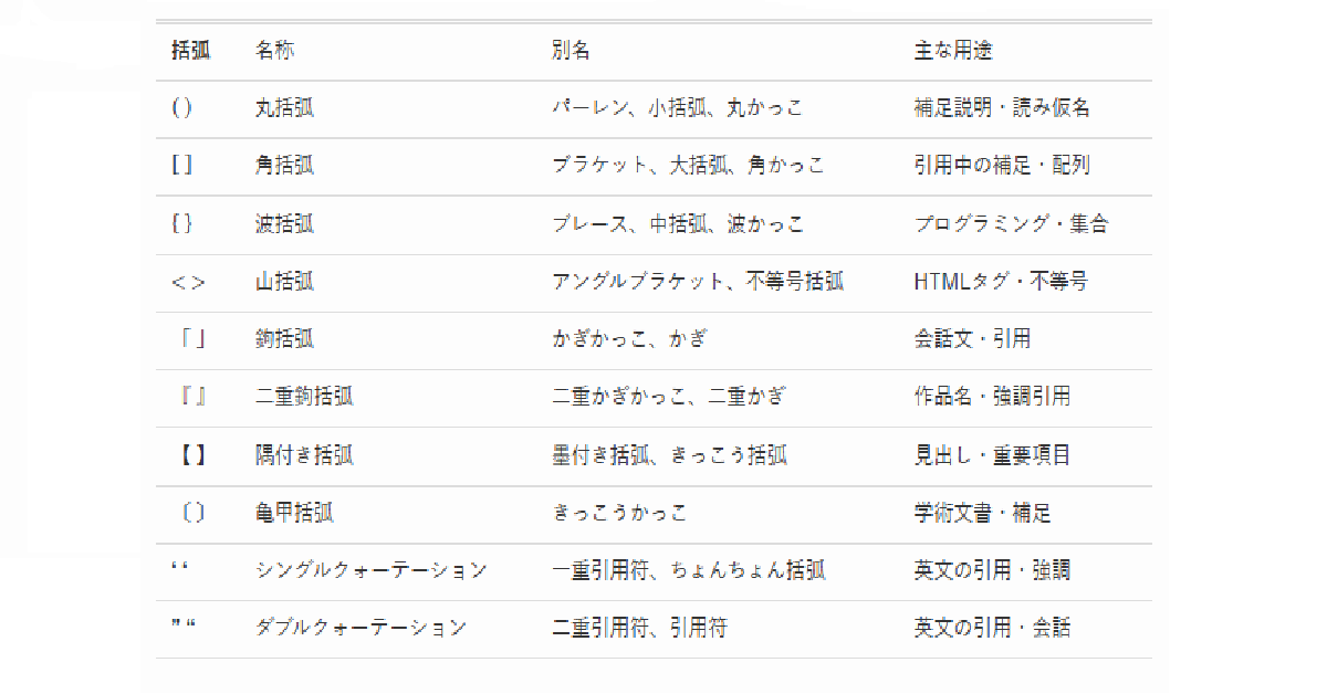 | 括弧 | 名称 | 別名 | 主な用途 |